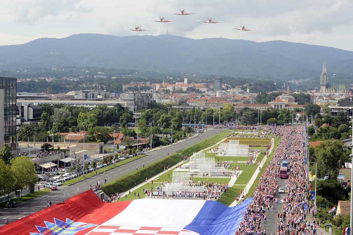 Hrvatska zastava na helikopteru Hrvatskog ratnog zrakoplovstva iznad zagrebačkog neba oduševila je stotine tisuća okupljenih građana, a neuništiv duh hrvatskih nogometaša i njihovog izbornika pozdravila je i akrobatska skupina "Krila Oluje".