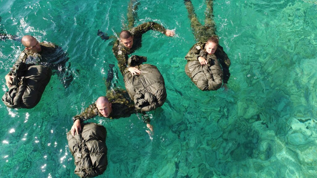Osim navedenog dijela obuke svi polaznici su morali svladati i pravilno plivanje u liniji uz pomoć australske splavi te skakanje u more s broda zajedno sa splavi, te je u ovom dijelu obuke sudjelovala Hrvatska ratna mornarica s desantnim brodom minopolagačem Krka koji je bio platforma za provođenje morske obuke.