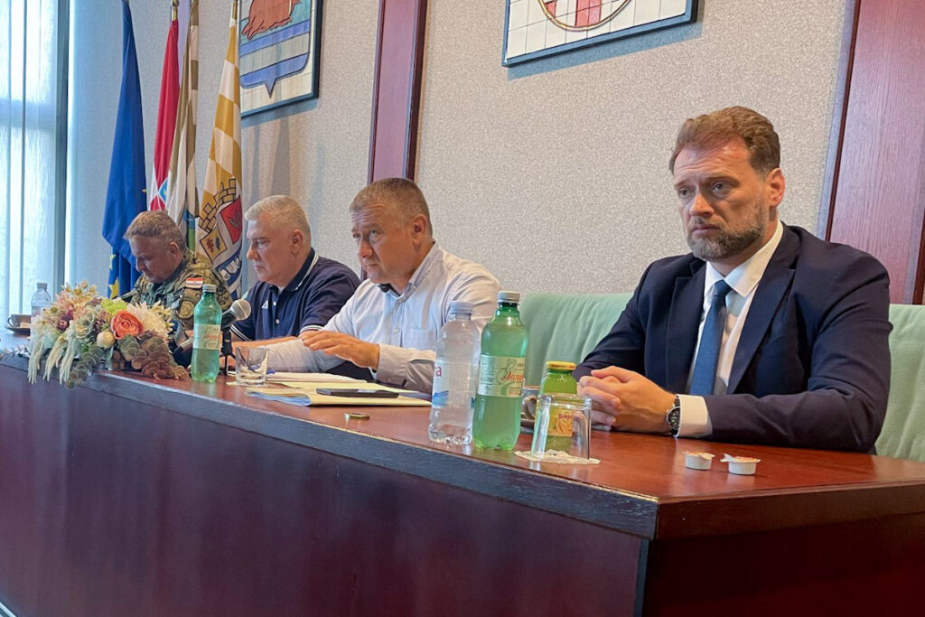 Ministar obrane Mario Banožić i zamjenik načelnika Glavnog stožera OSRH general-pukovnik Siniša Jurković nazočili su u subotu 22. srpnja 2023. godine u Vinkovcima sjednici županijskog Stožera civilne zaštite Vukovarsko-srijemske županije.