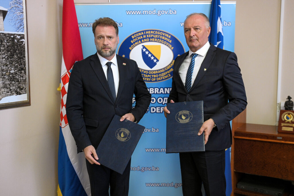 Ministri Banožić i Helez na sastanku su potpisali Sporazum između Ministarstva obrane Republike Hrvatske i Ministarstva orane Bosne i Hercegovine u području izobrazbe, koji će omogućiti nastavak suradnje i aktivnog doprinosa Hrvatske potrebama Ministarstva obrane BiH za vojnom izobrazbom.
