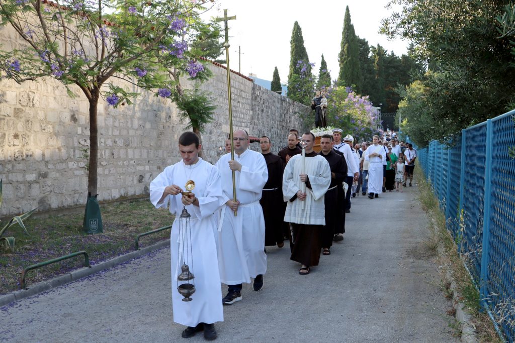 Procesija, u kojoj su pripadnici HRM-a nosili kip sv. Ante oko samostanskog kompleksa, prethodila je euharistijskom slavlju koje je u dvorištu samostana predvodio mons. Marin Barišić, splitsko-makarski nadbiskup u miru.