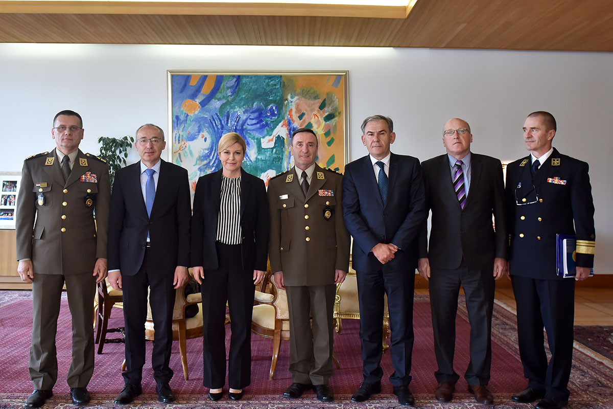 Načelnik Glavnog stožera OS RH izvijestio je predsjednicu Republike o aktualnom stanju u misijama i operacijama potpore miru u kojima sudjeluju pripadnici Hrvatske vojske, aktualnim i predstojećim značajnijim vježbovnim aktivnostima HV-a te o ključnim raspravama, inicijativama i projektima koji se provode u okviru Zajedničke sigurnosne i obrambene politike Europske unije te unutar NATO-a. Također je predstavljen plan predstojećeg obilježavanja Dana Oružanih snaga.