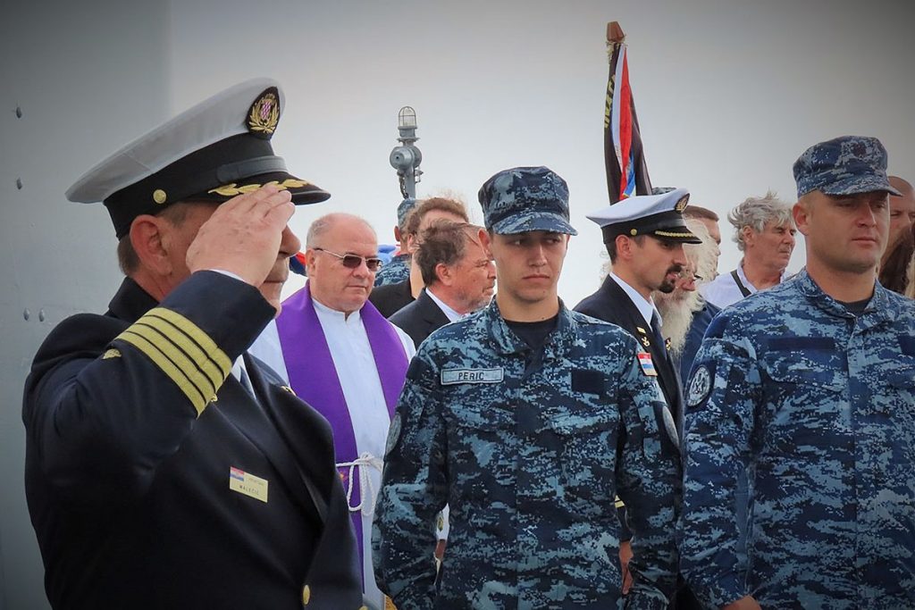 Na poziciju polaganja vijenca došlo se raketnom topovnjačom RTOP-42 “Dubrovnik”, a nakon blagoslova koji je predvodio vojni kapelan o. Jozo Mravak, ronitelji HRM-a položili su vijenac na spomen ploču pod morem.