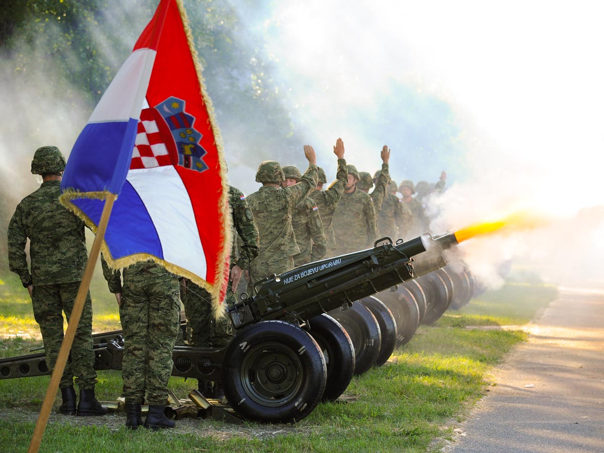 Svečani program na zagrebačkom Jarunu je započeo ispaljivanjem 26 počasnih plotuna koje su pripadnici Samohodne haubičke bojne Topničko-raketne pukovnije Hrvatske kopnene vojske ispalili iz osam brdskih topova kalibra 76 milimetara. Svaki plotun je pri tom simbolizirao jednu godinu u dvadeset i šest godina dugoj povijesti Oružanih snaga Republike Hrvatske i podsjećao je da su u temelje naše Domovine ugrađeni životi mnogih hrvatskih sinova i kćeri.