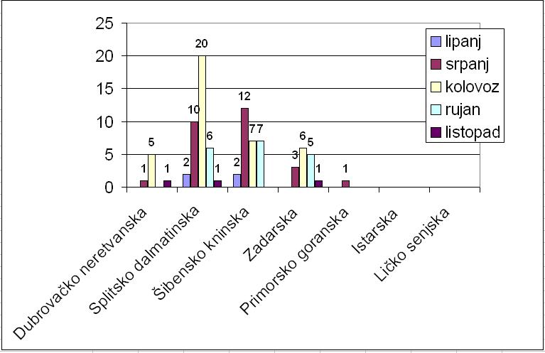 Ukupna opožarena površina je cca 1 169,65 ha. Sukladno broju požara po županijama ekvivalent je i veličini opožarenih površina što pokazuje da je najviše u Splitsko dalmatinskoj županiji cca 608,3 ha, dok je u Primorsko goranskoj najmanje opožarene površine, svega 2,5 ha.