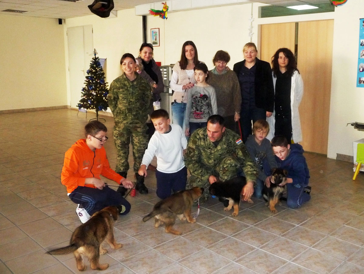 Djelatnici Obučnog centra vodiča i službenih pasa Vojne policije "Satnik Krešimir Ivošević" posjetili su ovih dana Udrugu za pomoć djeci s posebnim potrebama "ADHD I JA" u Dugom Selu, a u posjet su poveli i štence iz Voda za uzgoj pasa, kojima su se djeca posebno razveselila.