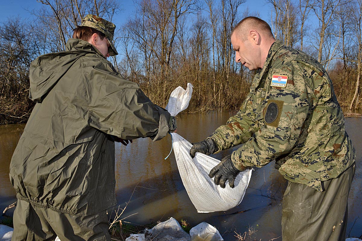 Pripadnici OS RH, u suradnji s općinskim vlastima, pune vreće s pijeskom i pojačavaju nasipe kako bi pomogli stanovnicima čiji su domovi ugroženi. Svi pripadnici NOS-a prošli su obuku po posebnom elaboratu obrane od poplava.