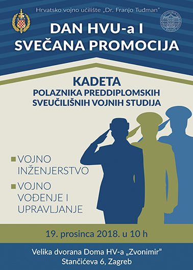 Obilježavanje 27. obljetnice osnivanja Hrvatskog vojnog učilišta "Dr. Franjo Tuđman" i promocija kadeta polaznika preddiplomskih sveučilišnih studija Vojno inženjerstvo i Vojno vođenje i upravljanje, održat će se u srijedu, 19. prosinca 2018., s početkom u 10 sati u Domu Hrvatske vojske "Zvonimir" u Zagrebu.