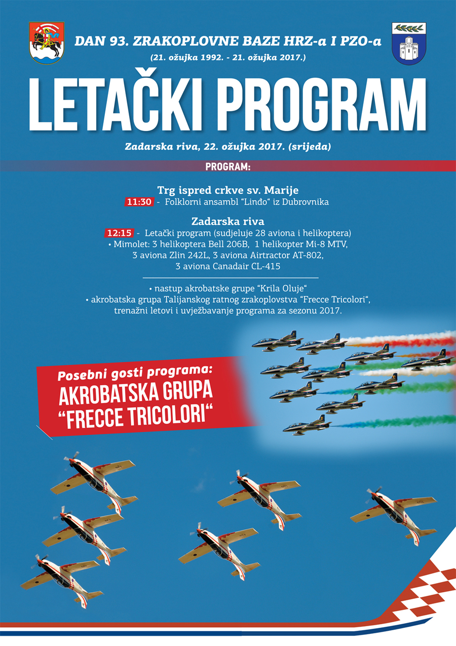 Povodom Dana postrojbe i 25. obljetnice osnutka, 93. zrakoplovna baza Hrvatskog ratnog zrakoplovstva i protuzračne obrane (HRZ i PZO) organizira letački program u srijedu, 22. ožujka 2017. od 12,15 do 14,00 sati u Zadru, Obala kralja Petra Krešimira IV.