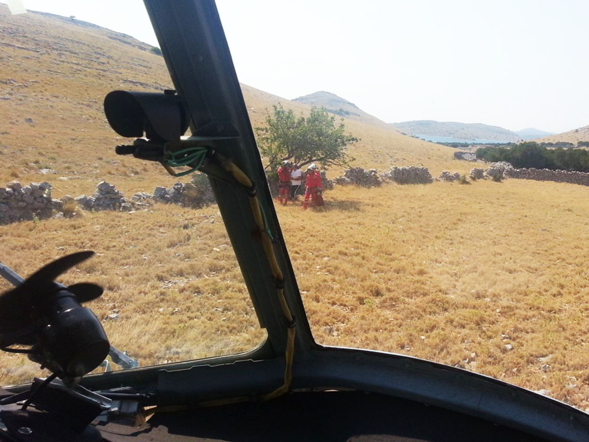 U subotu, 18. srpnja 2015. godine, oko 15,00 sati započela je akcija potrage i spašavanja muške osobe koja je prema dobivenim informacijama dehidrirala na Velikom Kornatu. Odmah po dojavi, posada je poletjela prema helidromu splitskih Firula kako bi povezla pripadnike Hrvatske gorske službe spašavanja. Osoba je vrlo brzo locirana iz zraka, te je posada s pacijentom krenula u splitsku bolnicu Firule. Tijekom leta, posada je dobila dojavu o hitnom letu za Vis zbog utapanja muškarca. Nakon ukrcaja pacijenta na Visu, posada je poletjela prema KBC Firule.