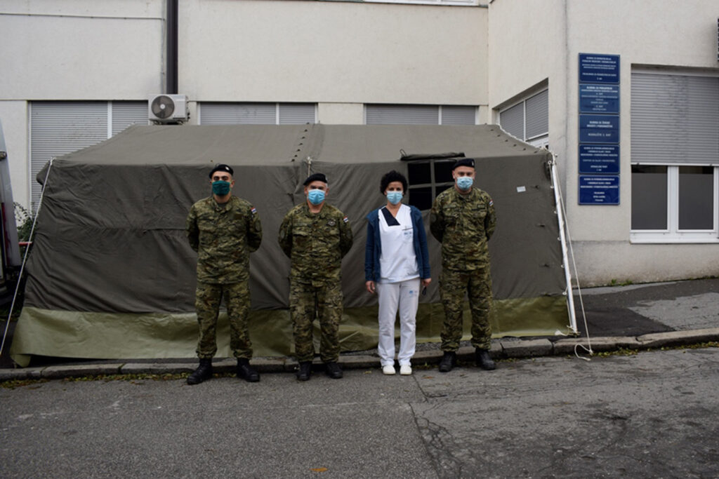 Bojna za opću logističku potporu Zapovjedništva za potporu do sada je ispred Kliničkog bolničkog centra “Sestre milosrdnice” u Zagrebu postavila ukupno osam šatora M70.