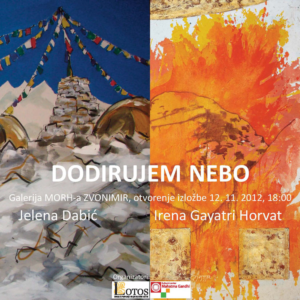 U galeriji MORH-a "Zvonimir" u Zagrebu, Bauerova 33, u ponedjeljak, 12. studenoga 2012. godine u 18 sati biti će otvorena izložba "Dodirujem nebo" autorica Jelene Dabić i Irene Gayatri Horvat a održava se u sklopu "Indijskog festivala svjetla".