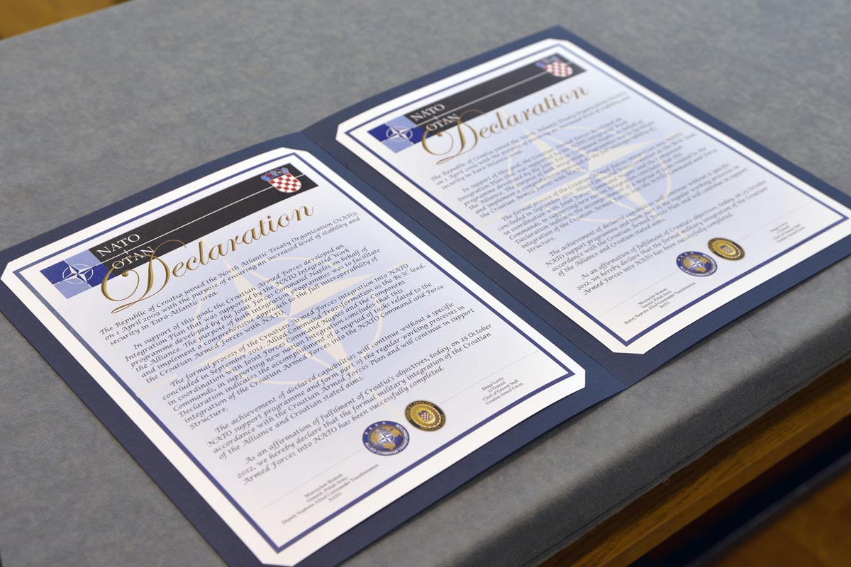 Načelnik GS OSRH general pukovnik Drago Lovrić i zamjenik zapovjednika Savezničkog zapovjedništva za transformaciju (ACT) poljski general zbora Mieczyslaw Bieniek danas su, 25. listopada 2012., svečano potpisali Deklaraciju o završetku integracijskog procesa OSRH u NATO strukture. Potpisivanje je uslijedilo nakon Završne integracijske konferencije u Časničkom domu HVU-a "Petar Zrinski", a nazočili su mu predstavnici OSRH, MORH-a, ACT-a, Savezničkog zapovjedništva združenih snaga Napulj te bivši načelnici GS OSRH.