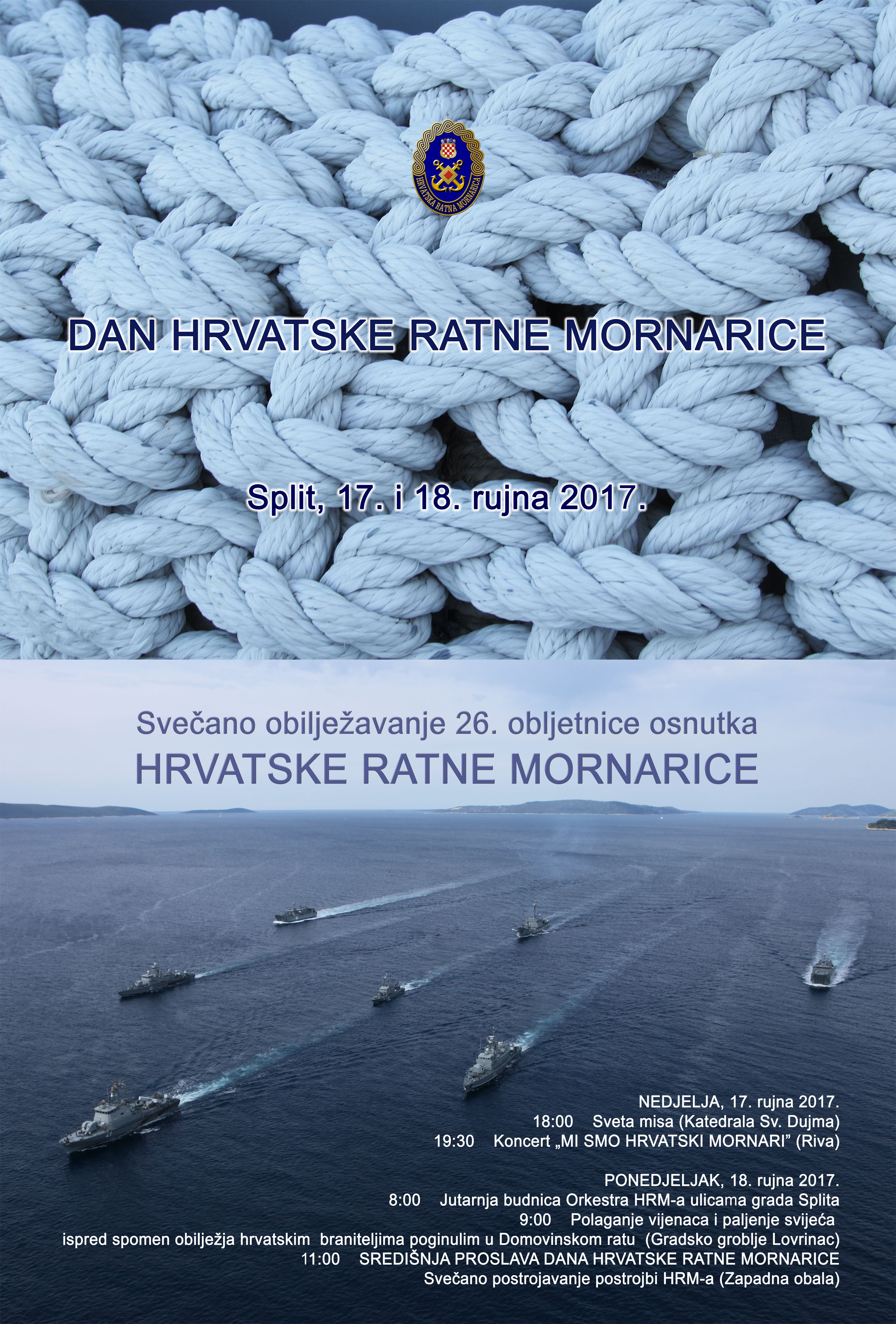 Obilježavanje Dana Hrvatske ratne mornarice i 26. obljetnice osnutka održat će se u nedjelju, 17. rujna i ponedjeljak, 18. rujna 2017. u Splitu.