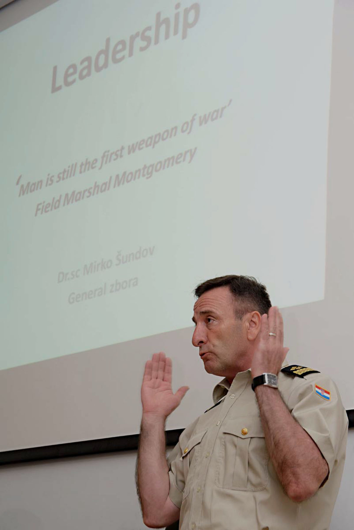 "Vi ćete provesti jednu godinu ovdje na Hrvatskom vojnom učilištu. Iskoristite ovu priliku da sakupite što više znanja jer je to jedinstvena prilika u vašoj karijeri", rekao je general Šundov u uvodnom dijelu predavanja, nakon čega je govorio o uvijek aktualnoj temi vojnog vodstva – što znači biti vojni lider, koje su njegove karakteristike i vrijednosti, kao i okvir njegova djelovanja te način na koji vodi svoju skupinu.