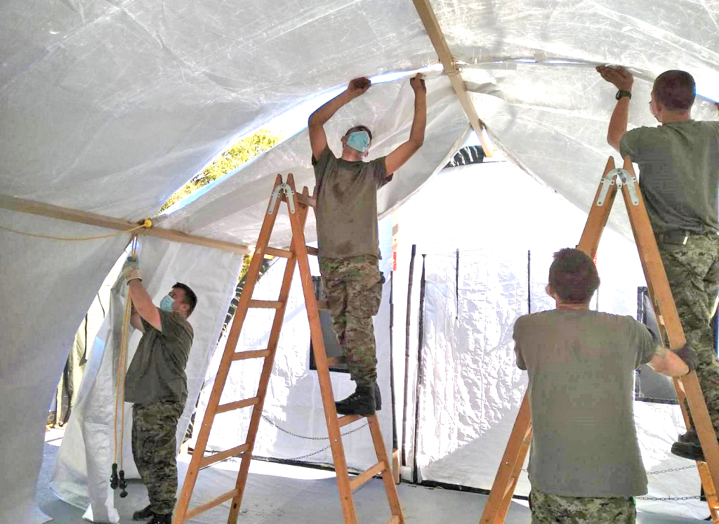 Tako je do sada, Hrvatska vojska ispred KB Dubrava Zagreb postavila pet šatora ekspedicijskog kampa, 20 šatora tipa Alaska; dva zapovjedna šatora tipa M70, 215 ležaja te je izgradila tunel koji povezuju šatore u kampu s bolnicom. Kod Klinike za infektivne bolesti Dr. Fran Mihaljević u Zagrebu postavljena su tri šatora tipa Alaska sa 30 ležaja, a kod KBC Zagreb – Rebro postavljana su tri grijana šatora iz Ekspedicijskog kampa. Pored KBC Sestre milosrdnice Zagreb – Vinogradska pripadnici Hrvatske vojske postavili su 11 šatora tipa M70, a kod Veterinarske bolnice Sveučilišta u Zagrebu postavili su tri šatora također tipa M70.