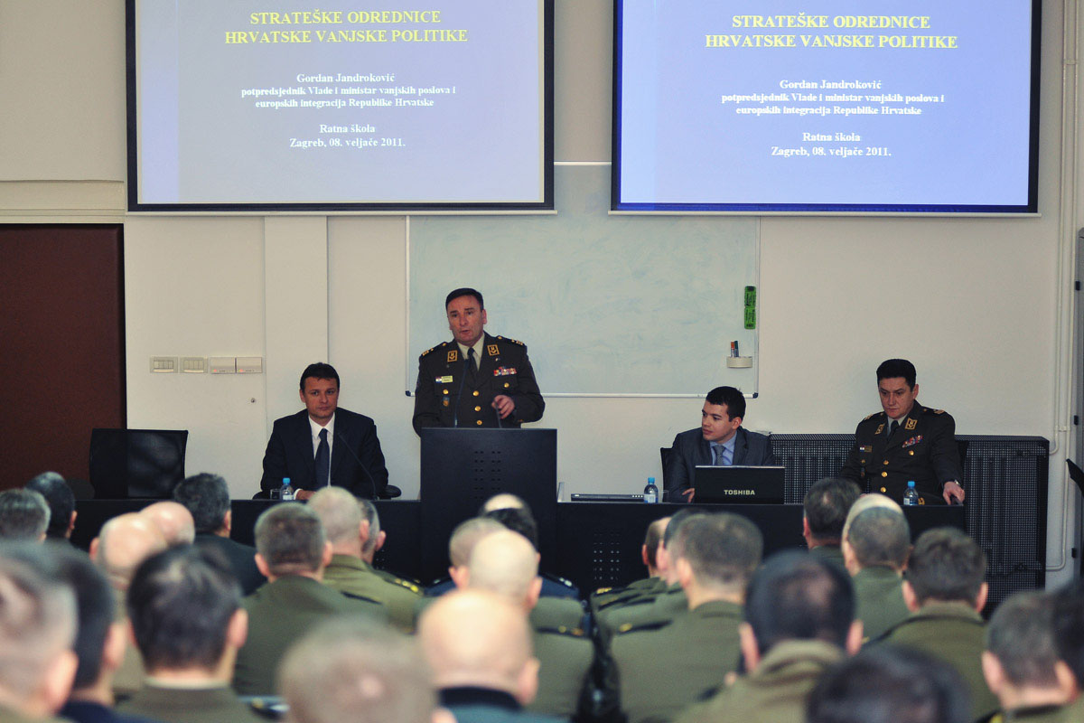 Potpredsjednik Vlade Republike Hrvatske i ministar vanjskih poslova i europskih integracija Gordan Jandroković danas, 8. veljače 2011. na Hrvatskom vojnom učilištu (HVU) "Petar Zrinski" održao je predavanje na temu: "Strateške odrednice Hrvatske vanjske politike".