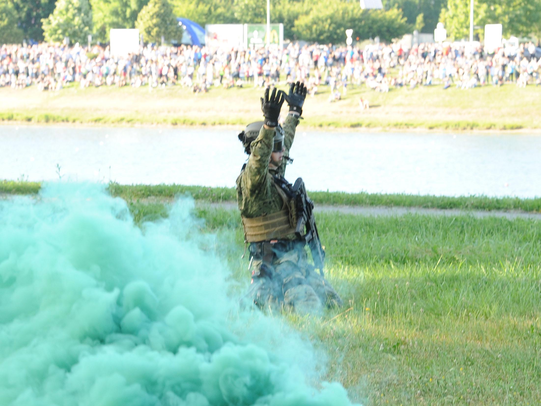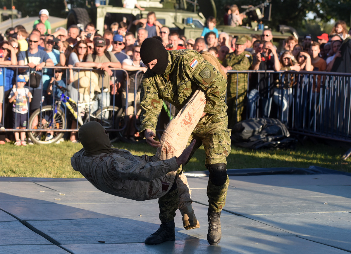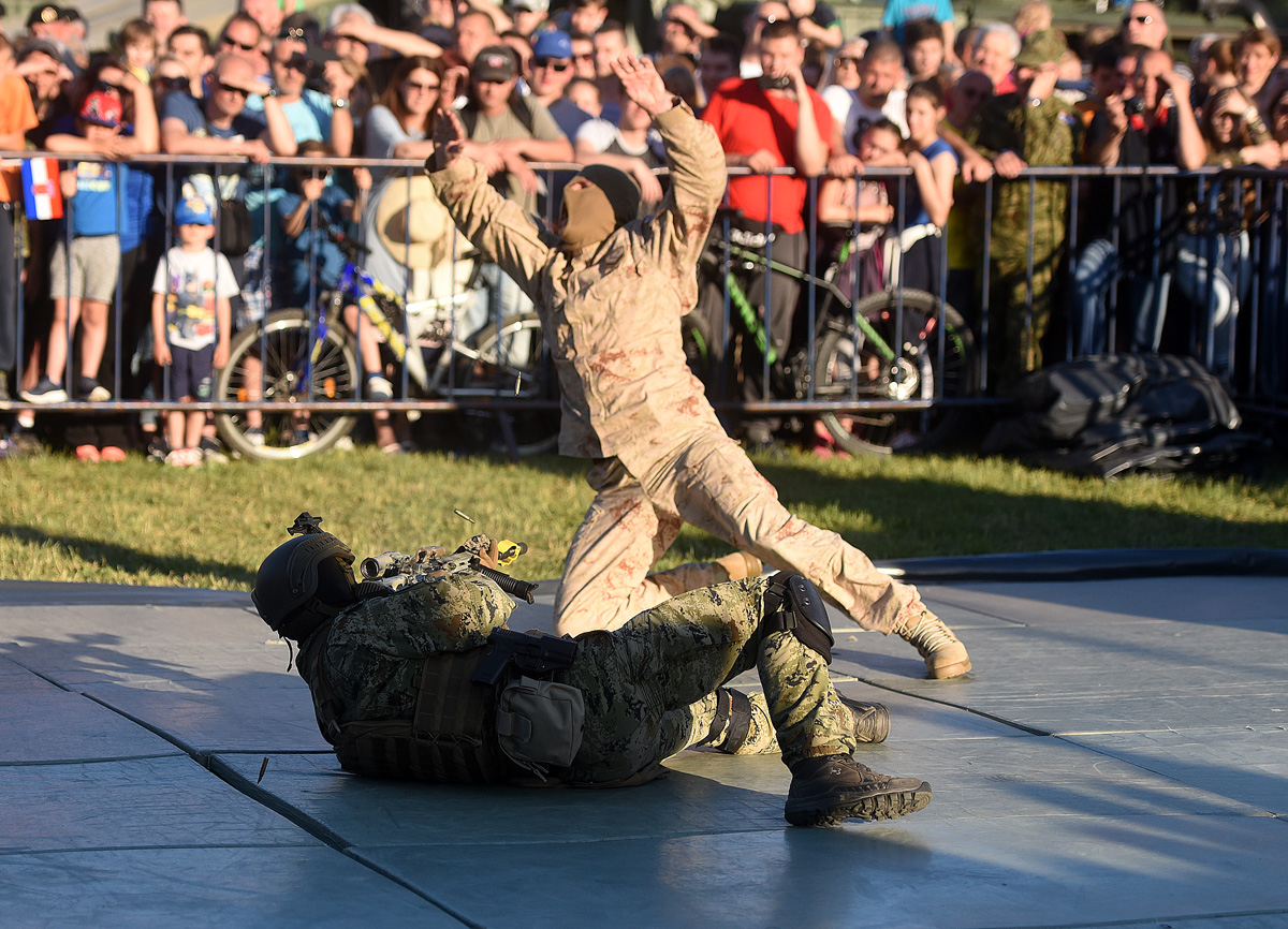 U nastavku programa je na jarunskom poluotoku izvedena pokazna vježba pripadnika Zapovjedništva specijalnih snaga "Borbeno traganje i spašavanje u neprijateljskom području", a prema zamišljenom scenariju, na poluotoku se u neprijateljskom području nalazio pilot Hrvatskog ratnog zrakoplovstva i protuzračne obrane koji je nestao u prijašnjoj akciji. Zadaća namjenskog tima za borbeno traganje i spašavanje Zapovjedništva specijalnih snaga bila je provođenje operacije borbenog traganja i spašavanja s ciljem povrata izoliranog pilota. Bila je to prilika da specijalci, po osposobljenosti i znanjima pripadnici vojne elite, demonstiraju dio svojih vještina: izlazak iz helikoptera tehnikom repelinga uz nošenje naoružanja i opreme, osiguravanje zone za slijetanje, lociranje, medicinsko zbrinjavanje, izvlačenje posebnom tehnikom (tzv. "grozd") i sl. što je gledateljstvo na zagrebačkom Jarunu s napetošću pratilo i pozdravilo čvrstim pljeskom.