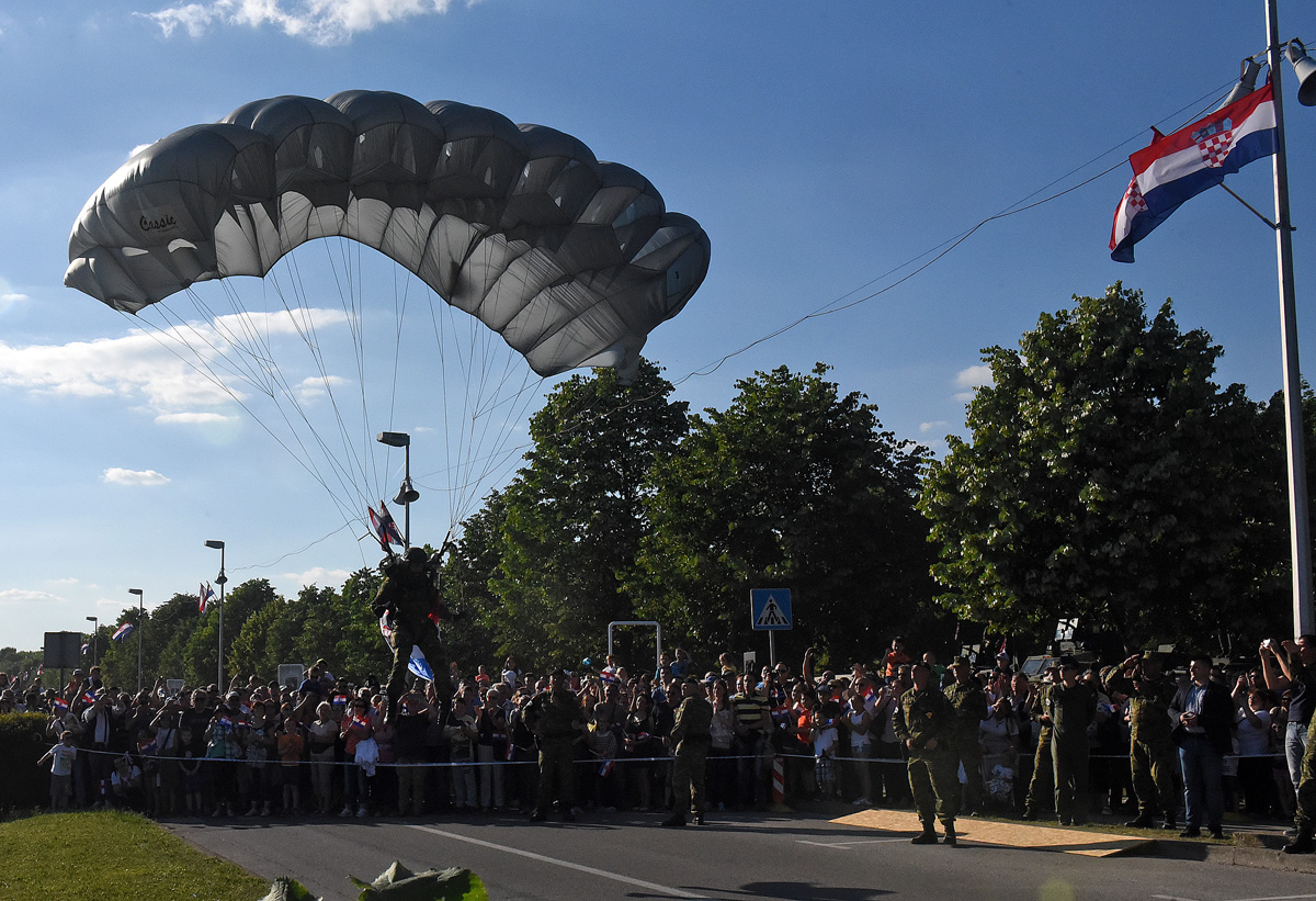 Brojni okupljeni i zainteresirani gledatelji su tom prigodom mogli saznati kako je brzina padobranaca u slobodnom padu od 200-250 km/h, ovisno o težini i položaju tijela, a otvaranje padobrana prvoga padobranca dogodilo se na visini od 750 m, dok ostali otvarali padobrane slijedeći padobranca ispod sebe. Vrhunac ovog dijela prezentacije vojničkog umijeća bio je doskok jednog od najboljih padobranaca hrvatskih Oružanih snaga pred svečanu ložu nakon čega je, uz snažan pljesak i ovacije, zastavu Republike Hrvatske uručio predsjednici Republike Hrvatske i vrhovnoj zapovjednici Oružanih snaga Kolindi Grabar-Kitarović.
