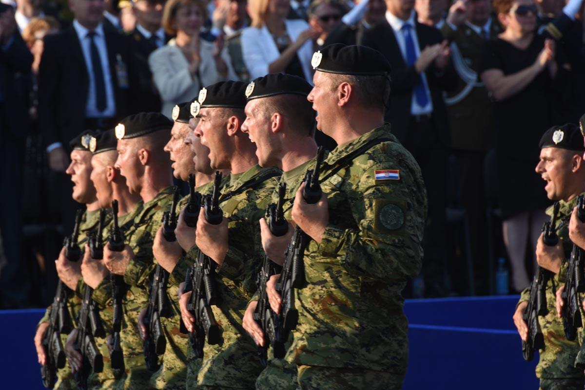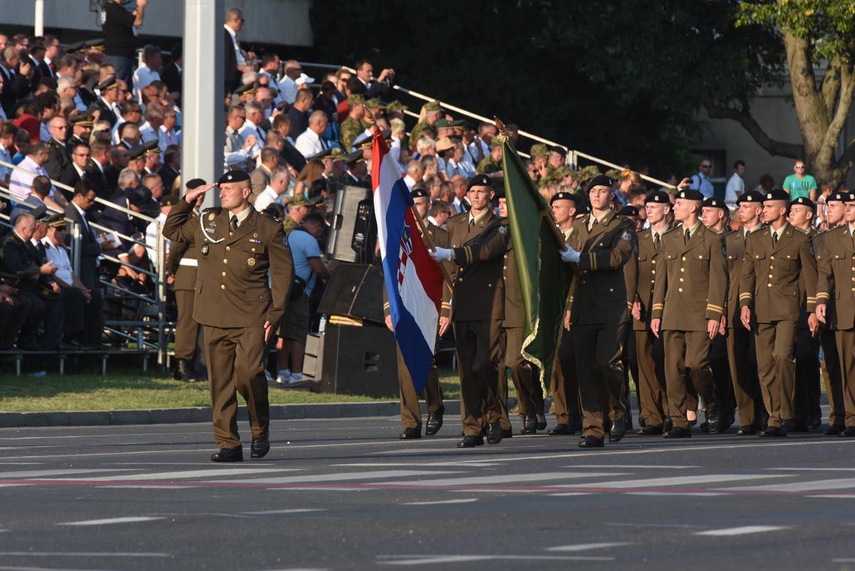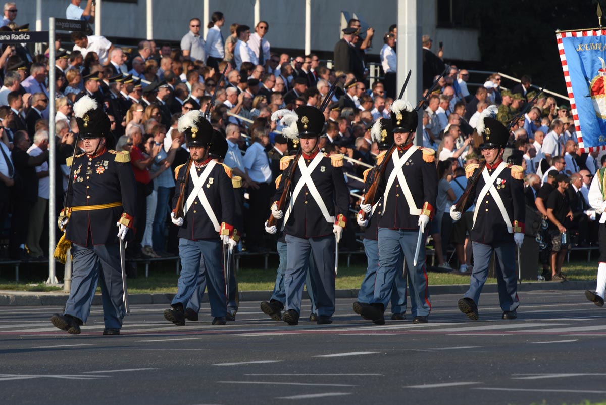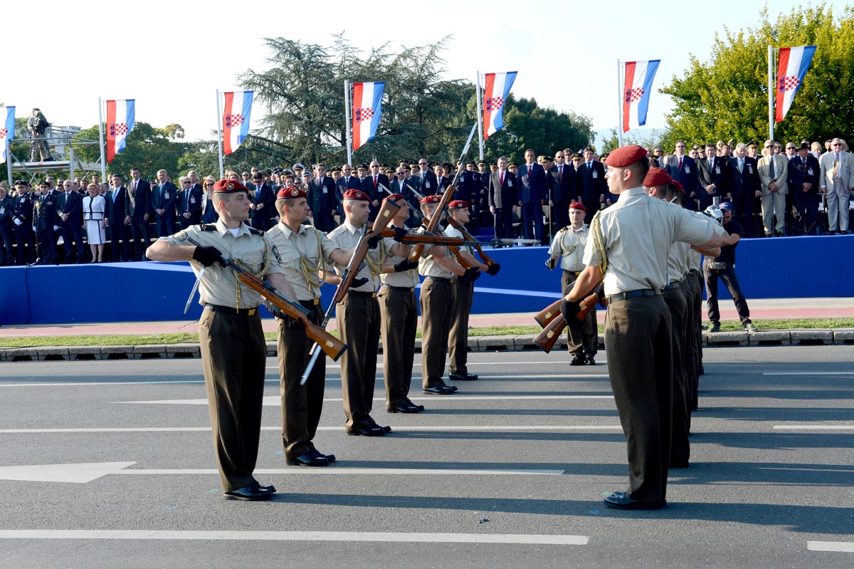Slijedio je postroj zastava Republike Hrvatske, Europske unije, NATO saveza, MORH-a, MUP-a RH, Glavnog stožera OSRH i drugih, a potom i postroj zastava postrojbi iz Domovinskog rata. Dok je Vukovarskom ulicom prolazio postroj hrvatskih branitelja, šest je brdskih topova M1-4/50 76 mm ispalilo 20 plotuna simbolizirajući dvadeset godina od VRO Oluja. Bogatu vojnu povijest predstavile su povijesne postrojbe, nakon kojih su krenule sastavnice Oružanih snaga Republike Hrvatske i Ministarstva unutarnjih poslova te postroj vatrogasaca i pripadnika Državne uprave za zaštitu i spašavanje. Prvi od pješačkih postroja bio je postroj kadeta, te postroj zastava partnerskih zemalja. Nakon njih uslijedili su redom Tigrovi, Gromovi, Kune, Pauci, Sokolovi, Pume, Vukovi, zatim pripadnici Zapovjedništva specijalnih snaga, Hrvatske ratne mornarice, Hrvatskog ratnog zrakoplovstva i protuzračne obrane te pješački postroj Vojne policije.