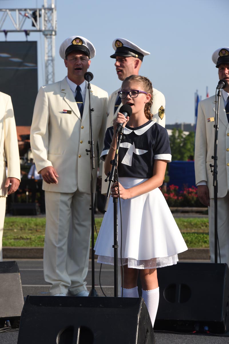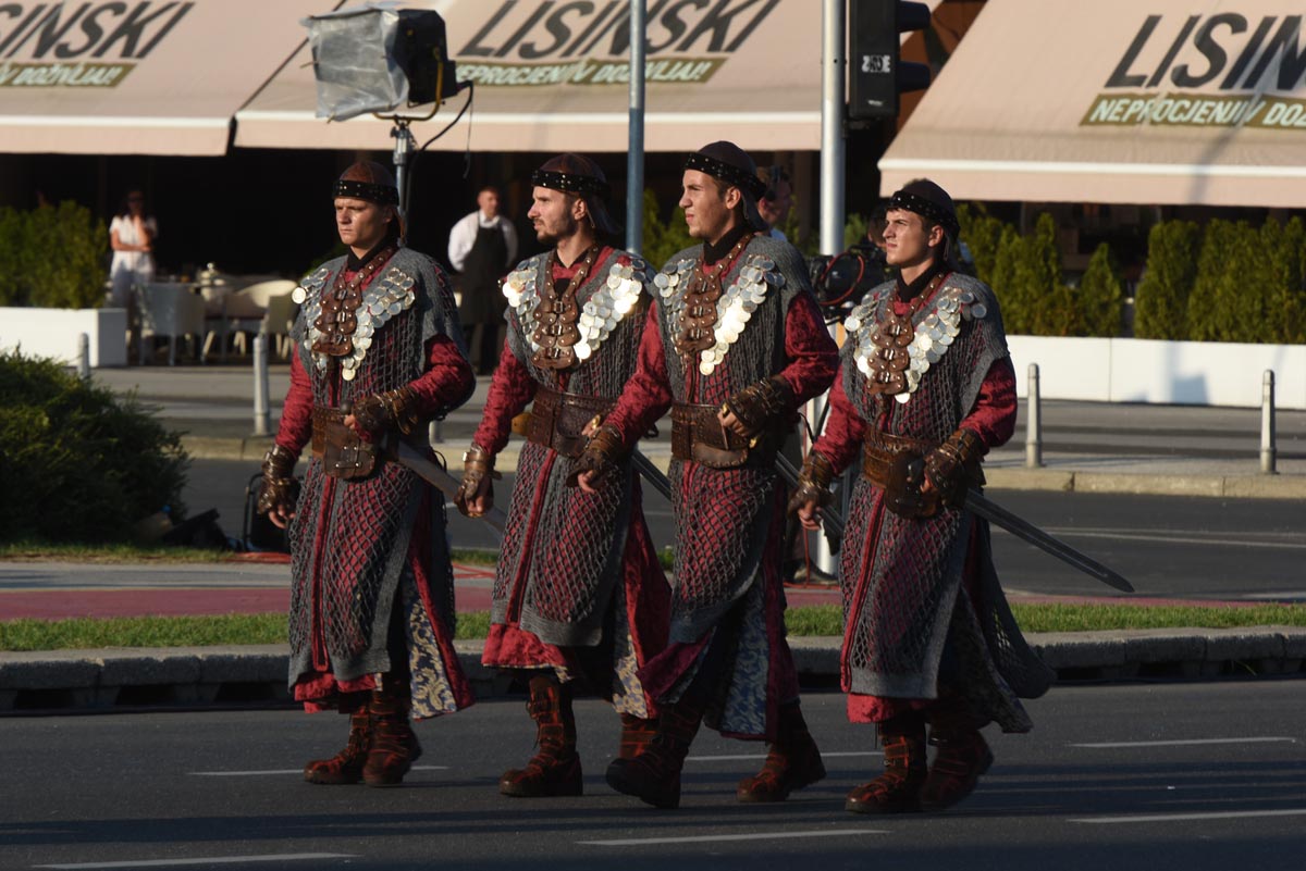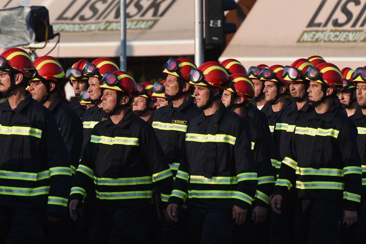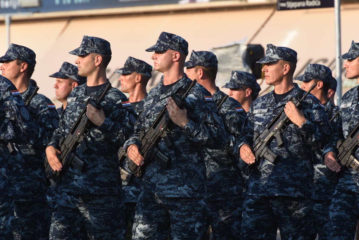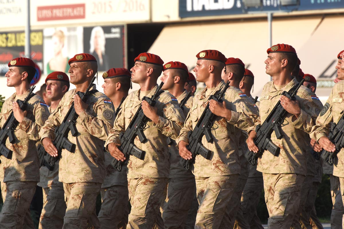 Slijedio je postroj zastava Republike Hrvatske, Europske unije, NATO saveza, MORH-a, MUP-a RH, Glavnog stožera OSRH i drugih, a potom i postroj zastava postrojbi iz Domovinskog rata. Dok je Vukovarskom ulicom prolazio postroj hrvatskih branitelja, šest je brdskih topova M1-4/50 76 mm ispalilo 20 plotuna simbolizirajući dvadeset godina od VRO Oluja. Bogatu vojnu povijest predstavile su povijesne postrojbe, nakon kojih su krenule sastavnice Oružanih snaga Republike Hrvatske i Ministarstva unutarnjih poslova te postroj vatrogasaca i pripadnika Državne uprave za zaštitu i spašavanje. Prvi od pješačkih postroja bio je postroj kadeta, te postroj zastava partnerskih zemalja. Nakon njih uslijedili su redom Tigrovi, Gromovi, Kune, Pauci, Sokolovi, Pume, Vukovi, zatim pripadnici Zapovjedništva specijalnih snaga, Hrvatske ratne mornarice, Hrvatskog ratnog zrakoplovstva i protuzračne obrane te pješački postroj Vojne policije.
