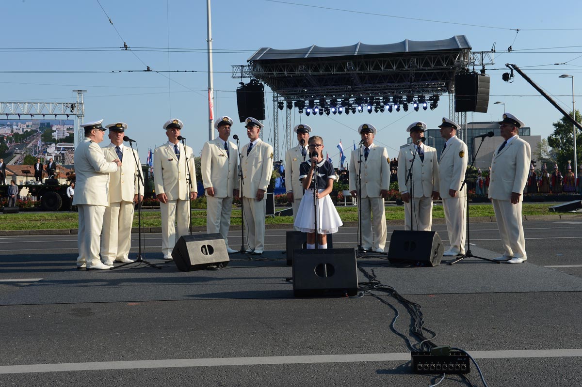 Dvanaestogodišnja Mia Negovetić u pratnji Klape HRM-a "Sveti Juraj" na početku je izvela državnu himnu, a iznad pozornice se zavijorila hrvatska zastava koja je prije dvadeset godina podignuta na Kninskoj tvrđavi. Zastavu su na svečanost donijeli kadeti OSRH. Predsjednica Republike izdala je zapovijed za početak mimohoda, nakon ćega su ispaljeni počasni plotuni, a nebom iznad Zagreba preletjela su tri borbena aviona HRZ i PZO-a MiG-21.
