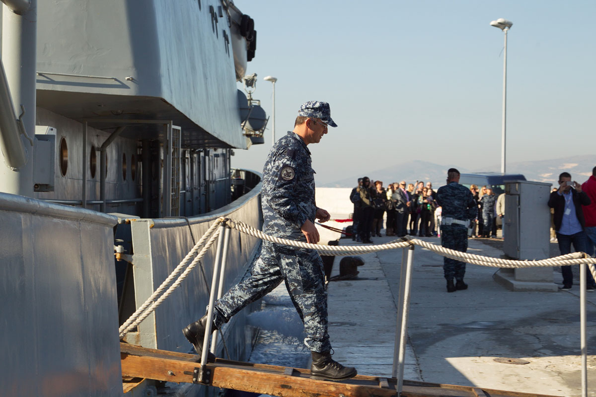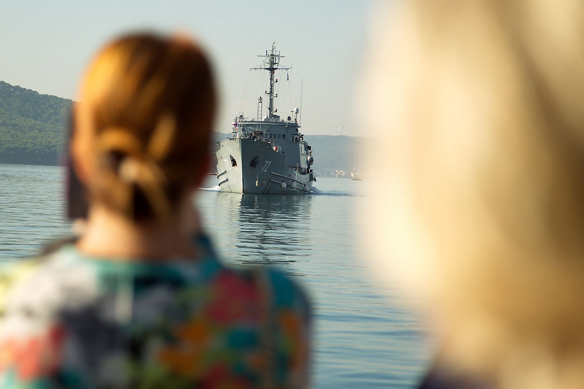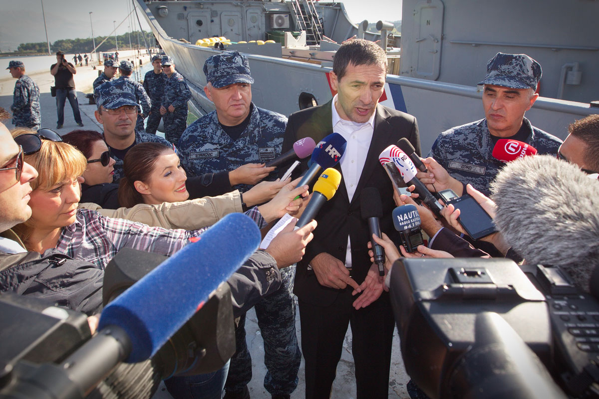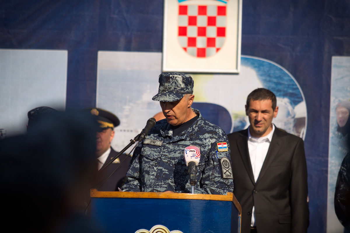 "Dobro došli u Hrvatsku!", prvo je poručio u svom obraćanju pristigloj posadi ministar obrane Ante Kotromanović. Izrazio je veliko zadovoljstvo zbog posla koji je posada napravila u tri mjeseca. "Pokazali smo da smo snažni, da smo organizirana država i da znamo upravljati krizama i u Sredozemlju i u Hrvatskoj. I to je naša poruka. Imamo sjajne ljude koji mogu obaviti sve zadaće", kazao je ministar i dodao da su spašavanjem više od 2,5 tisuće ljudi pokazali "vojničku crtu, vojnički karakter, ali i humanost i ljudsko lice, i to je ono što krasi hrvatskog vojnika ovdje na moru, a kad su u pitanju izbjeglice, i ono što radimo na kopnu", istaknuo je ministar Kotromanović. "Slušao sam komentare od ljudi koji vode operaciju, jako su vas hvalili" rekao je ministar posadi broda "nama je to dragocjeno iskustvo i motivira nas da još više ulažemo u HRM“, zaključio je ministar Kotromanović.