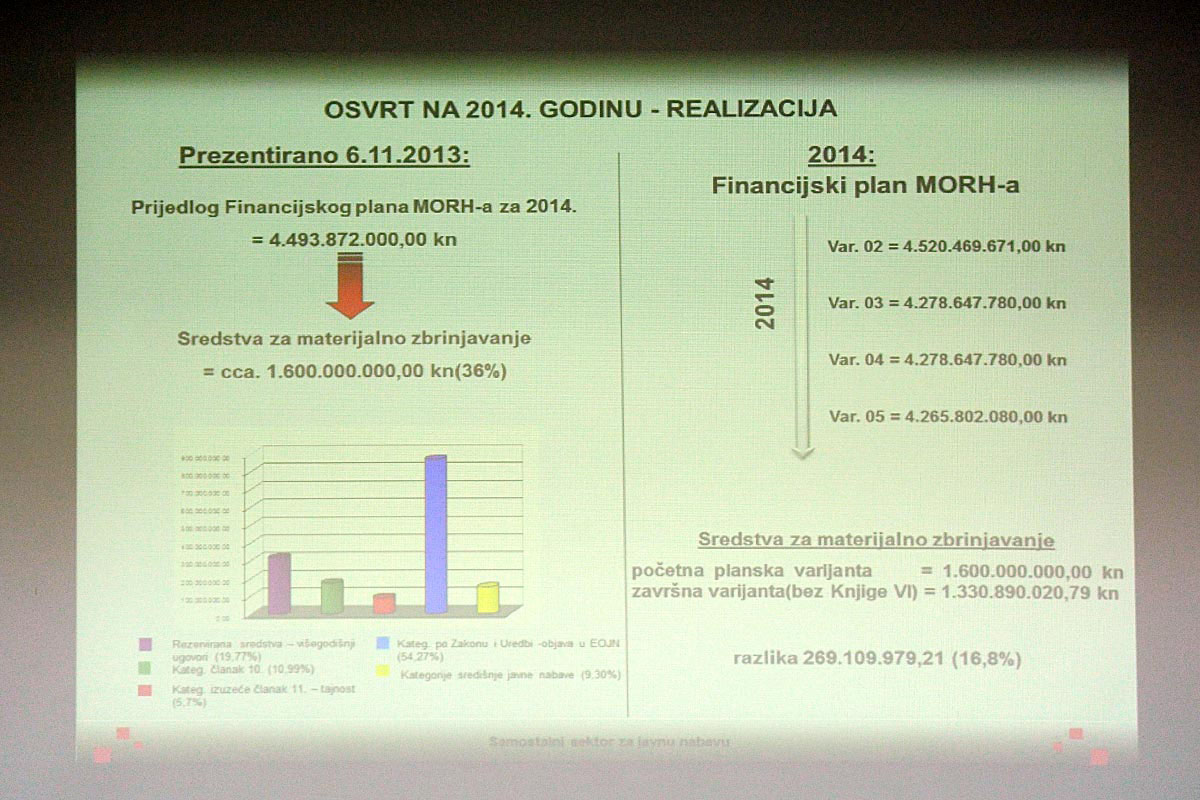 Prezentaciju Plana nabave MORH-a održao je načelnik Samostalnog sektora za javnu nabavu MORH-a Branko Pribolšan istaknuvši kako je u 2014. godini provedeno 1126 postupaka javne nabave i sklopljeno 1593 ugovora, te 206 okvirnih Sporazuma. Pribolšan je naglasio da je do 1. prosinca ugovoreno 95,8% planiranog, a u tijeku je i provedba ostatka predmeta nabave poput modernizacije radara Enhanced Peregrine, dopunskog zdravstvenog osiguranja, remont motora Rolls Royce, održavanja radara FPS117 i ostalih manjih predmeta nabave. „U 2014. godini ostvarene su znatne uštede od provedenih postupaka javne nabave u iznosu oko 100 milijuna kuna, što je prenamijenjeno u druge predmete nabave ili je ušlo u smanjenje proračuna, te je znatno umanjilo negativne posljedice smanjenja proračunskih sredstava“, rekao je Pribolšan.