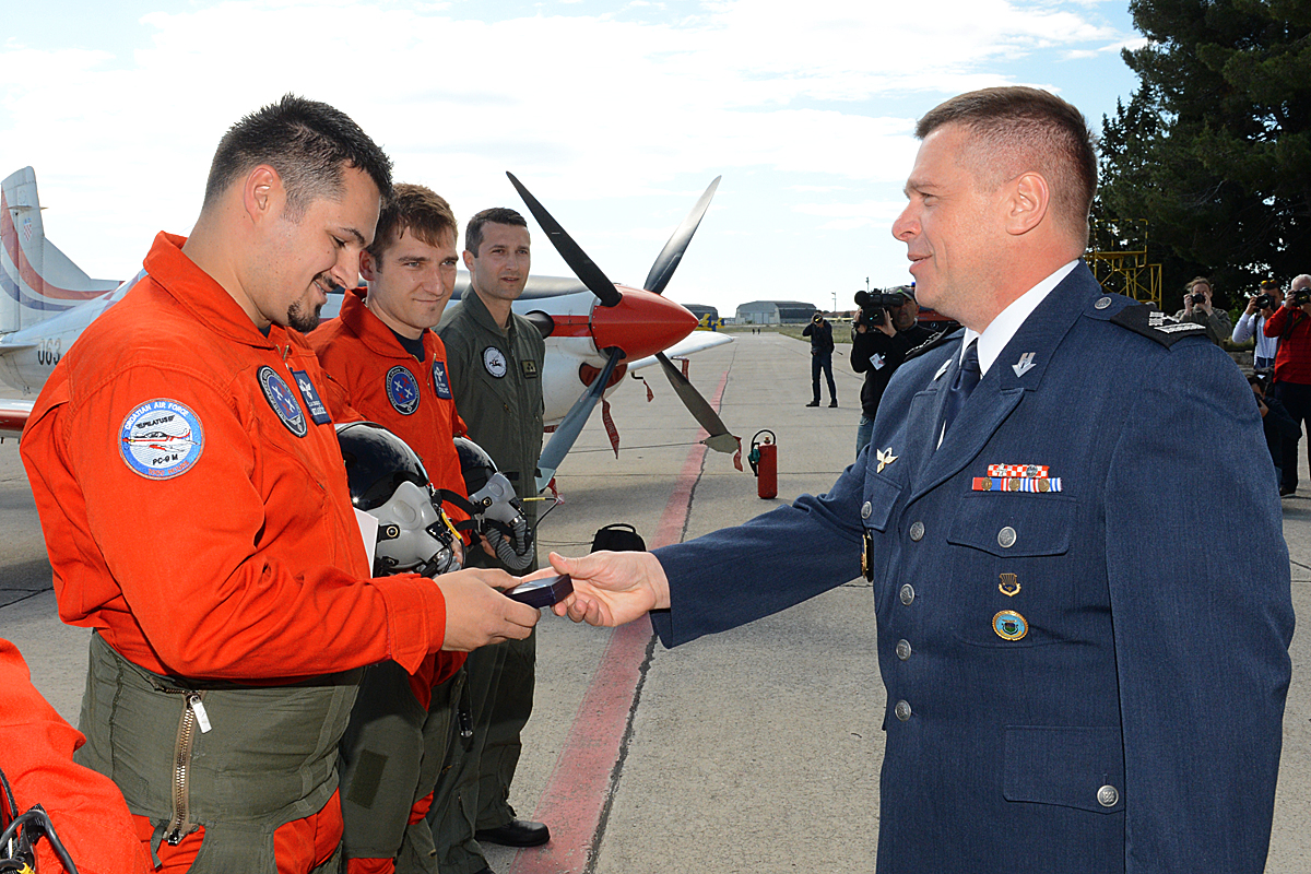 Nakon današnjeg predstavljanja dijela letačkog programa „Krila Oluje“, zapovjednik 93. zb brigadir Karol Lučan, uručio je pilotima akrobatske grupe značke te svjedodžbe o završenom osposobljavanju.