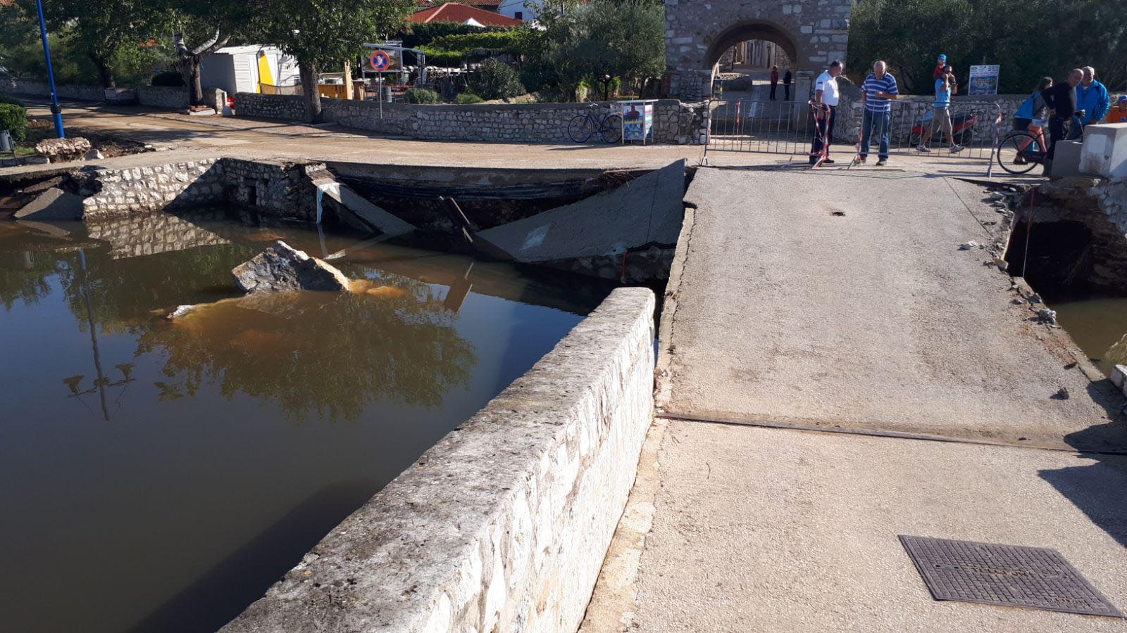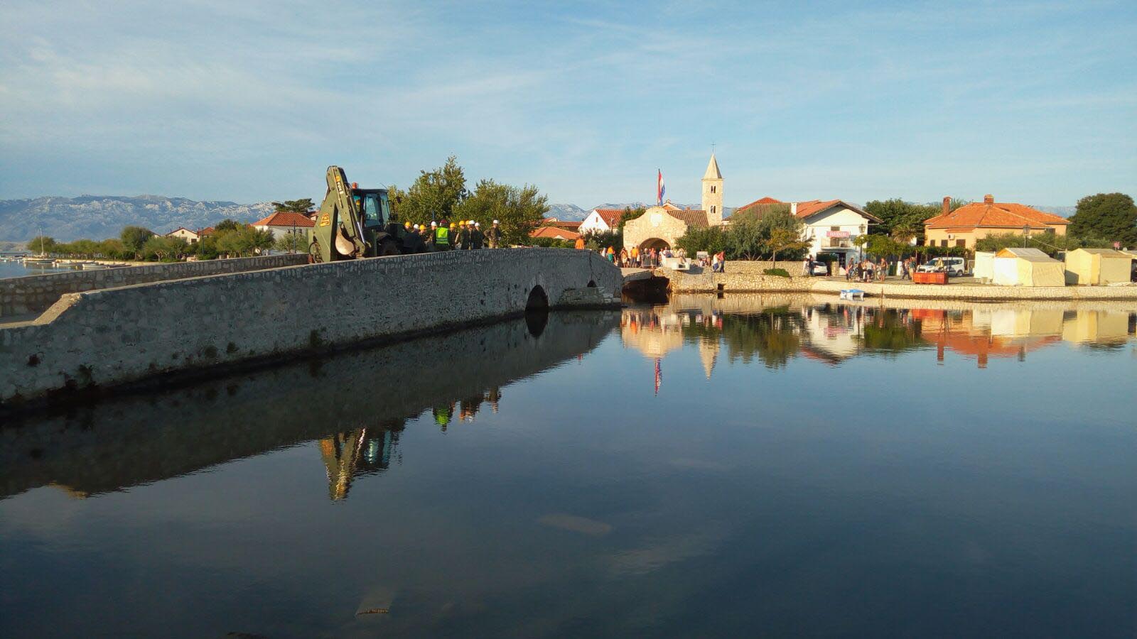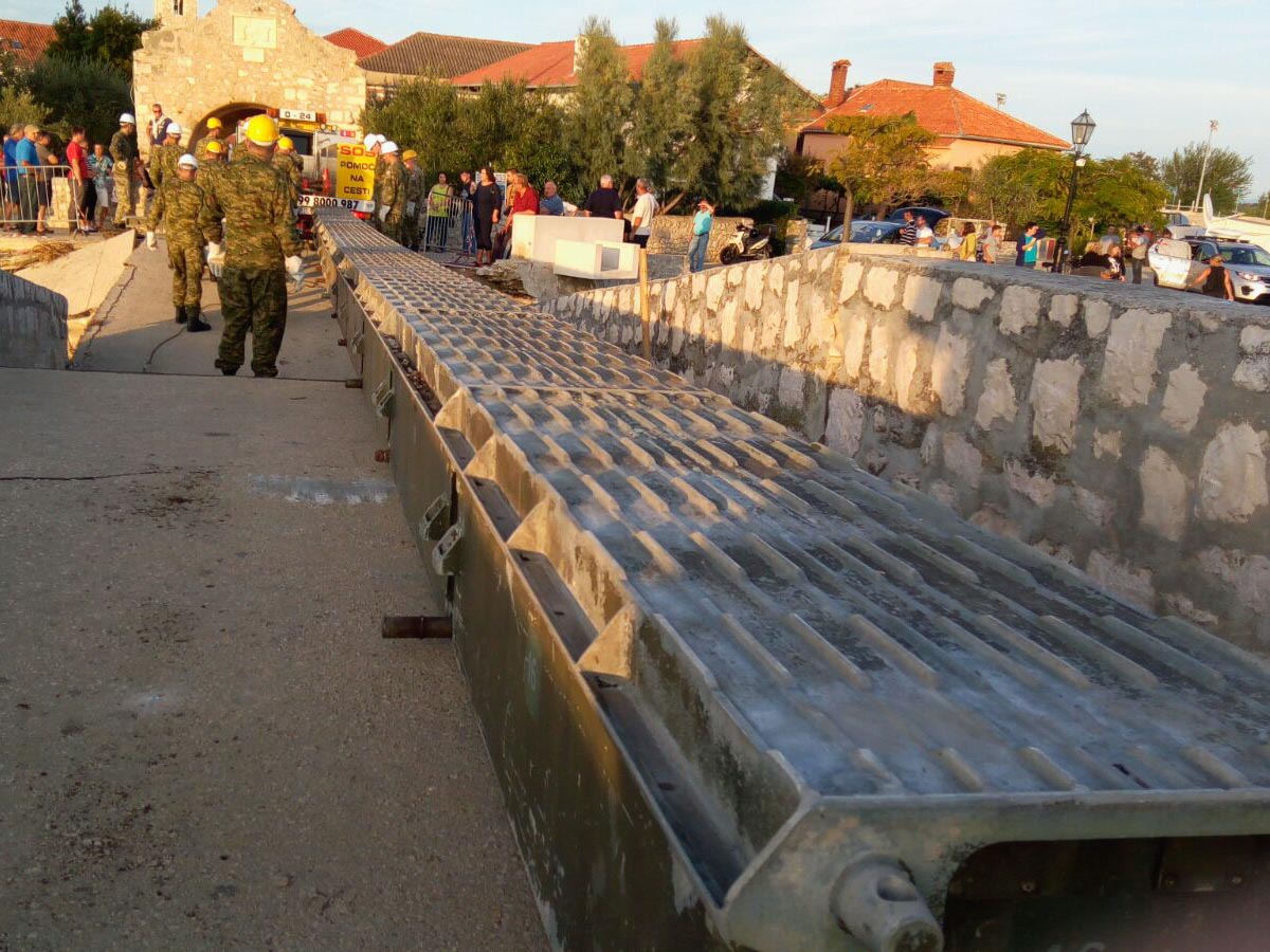 Pripadnici Protupoplavnog voda (PPv) Namjenski organiziranih snaga Oružanih snaga (NOS OS RH), njih 25, s dva inženjerijska stroja i dva kamiona-labudice angažirani su danas, u srijedu, 13. rujna 2017., u poslijepodnevnim satima, na postavljanju privremene aluminiske konstrukcije dužine 22 metra na Donji kameni mosta u Ninu.