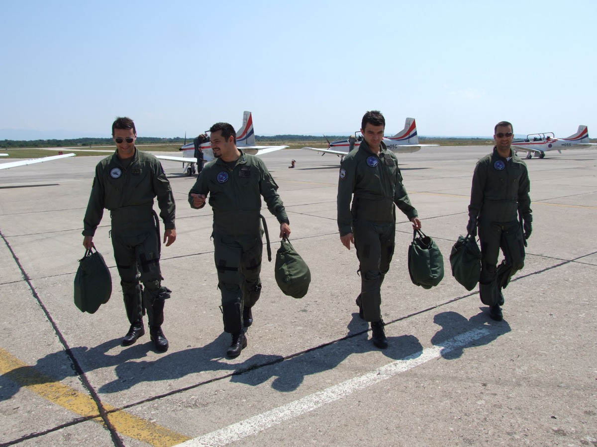 Satnik Mravunac prethodno je uspješno završio obuku za DEMO pilota, a nastavlja obuku u akrobatskoj grupi kroz dvije faze. U prvom dijelu kroz 30-ak letova uvježbavaju se osnovni elementi koje izvode isključivo akrobatske grupe na visinama od 100 do 1000 metara pri iznimno malim udaljenostima između aviona u formaciji. Nakon toga slijedi uvježbavanje službenog programa za ovu sezonu, kojim se grupa već predstavila javnosti nastupima u vojarni Zemunik i na manifestaciji „Red Bull Air Race“ u Rovinju, a satnik Mravunac težišno uvježbava svoju poziciju dok se grupa privikava na puni sastav letenja sa šest aviona Pilatus PC-9M.