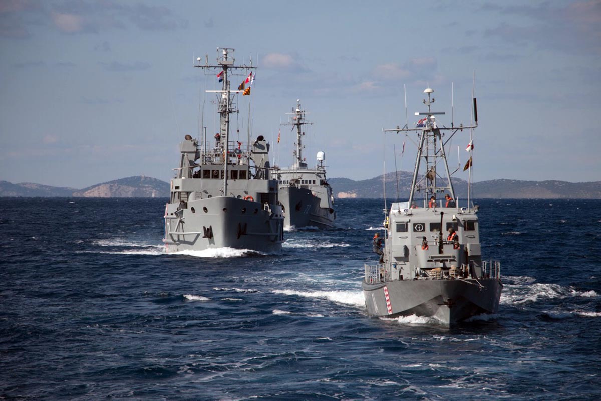 U skladu s nacionalnim i savezničkim publikacijama za obuku i vježbe, brodske posade će uvježbavati pripremu i provedbu taktičkih radnji i postupaka na moru, u luci i u plovidbi; procedure kretanja do područja provedbe; protubrodsko osiguranje; topničko gađanje ciljeva na moru; taktičko manevriranje; prekrcaj desantnih snaga na moru i iskrcaj na kopno; zaštitu snaga u luci, na sidrištu, otvorenom moru i priobalnim vodama; popunu brodova na moru; operacije traganja i spašavanja; protuminsko osiguranje dijela akvatorija; tegljenje brodova; te signalne vježbe u području baziranja.